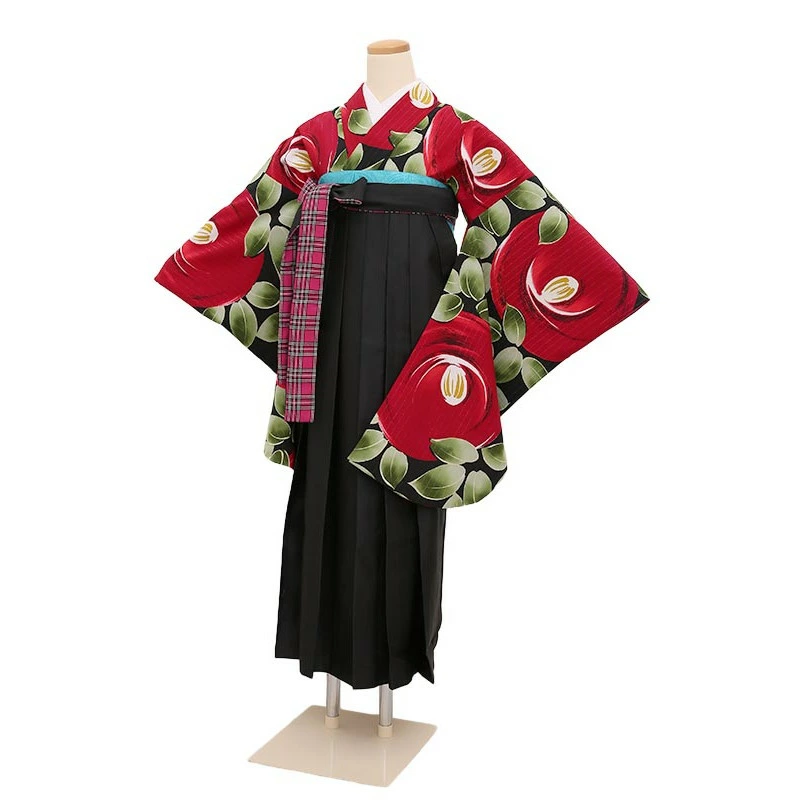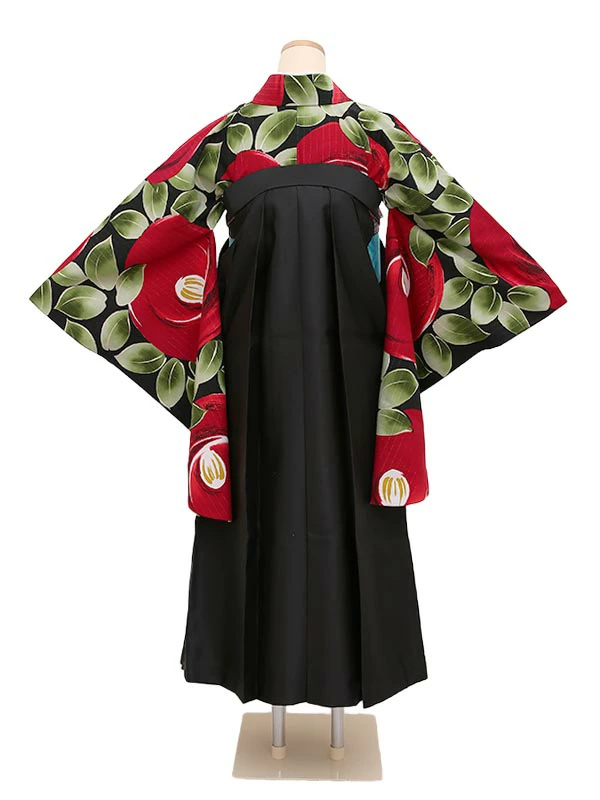 袴 レンタル 黒地椿×紺袴 158cm-163cm [7号-13号] 大学生 卒業袴 貸衣装 女性 着物 専門学校 謝恩会 和装【0AG0011】0011