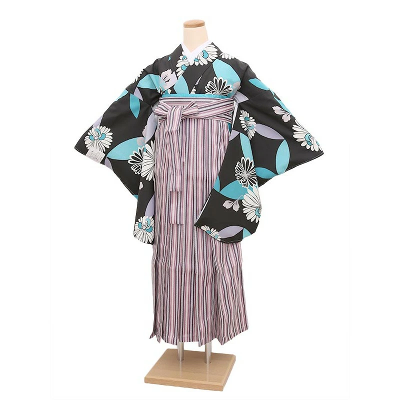 袴レンタル 黒地水色に菊×縞袴セット 158cm-163cm [7号-13号] 大学生 卒業袴 貸衣装 女性 着物 専門学校 謝恩会 和装【0AG0029】