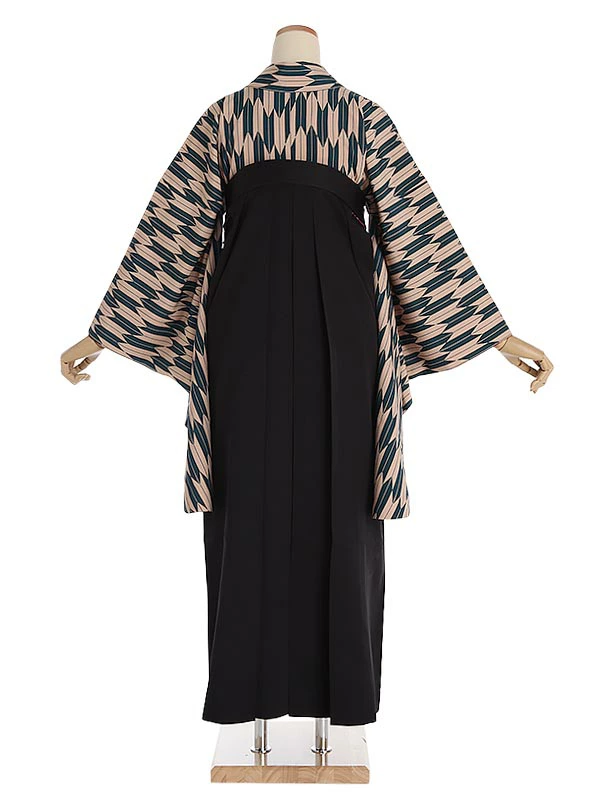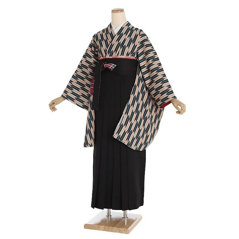 袴レンタル ベージュ矢絣×黒袴セット 155cm-160cm [7号-13号] 大学生 卒業袴 貸衣装 女性 着物 専門学校 謝恩会 和装【0AG0043】
