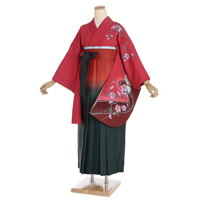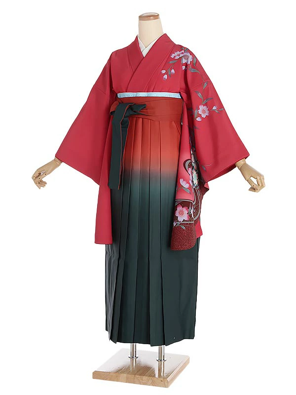 袴レンタル 桜に流水×赤緑ぼかし袴セット 153cm-158cm [7号-13号] 大学生 卒業袴 貸衣装 女性 着物 専門学校 謝恩会 和装【0AG0059】