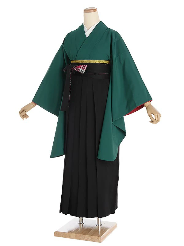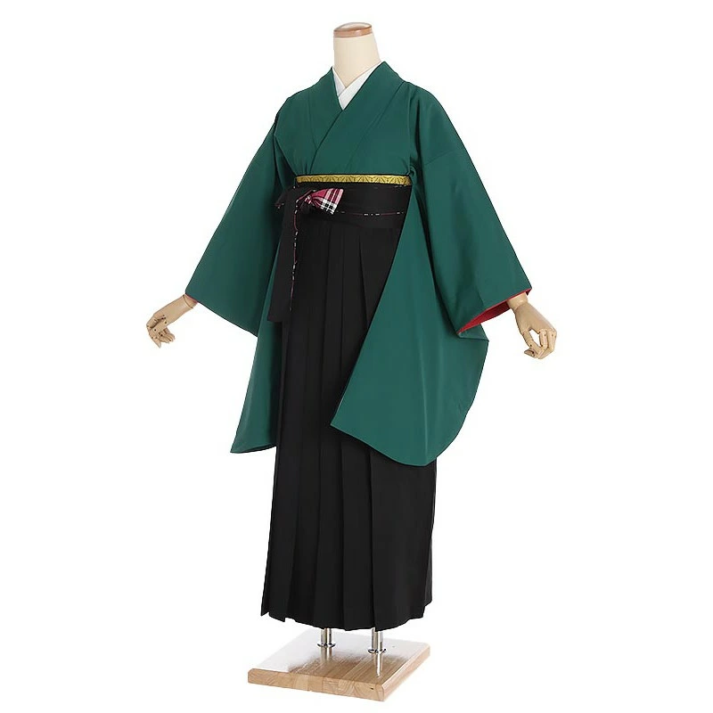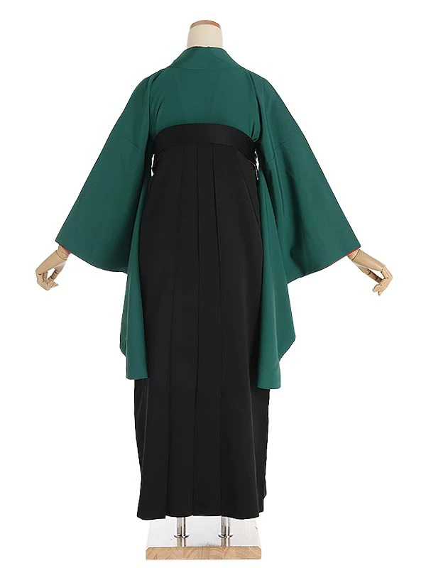 袴レンタル 緑無地×黒袴セット 150cm-155cm [7号-13号] 大学生 卒業袴 貸衣装 女性 着物 専門学校 謝恩会 和装【0AG0063】