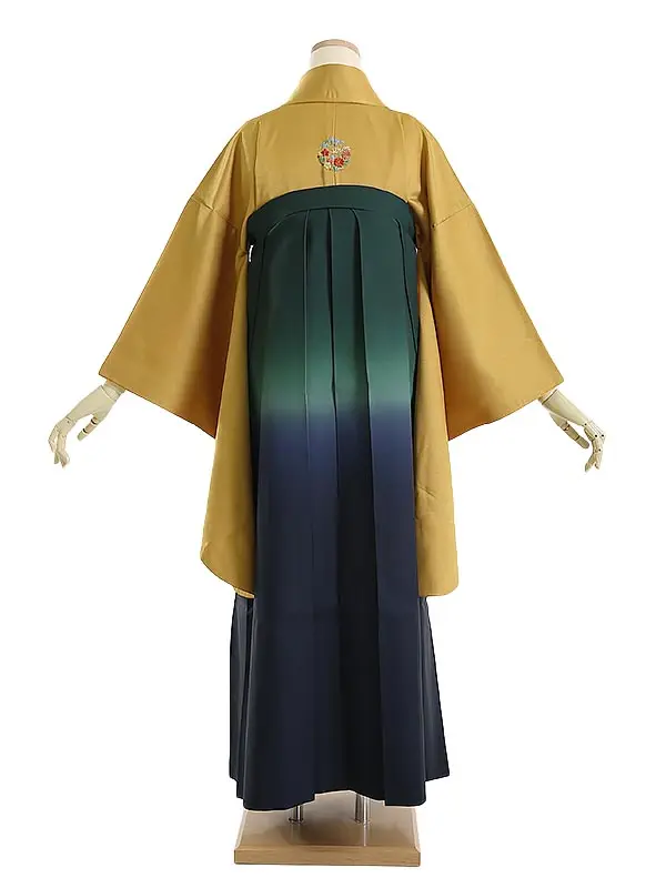 袴 0111 からし無地に花紋刺繍×緑紺グラデ袴