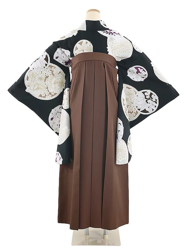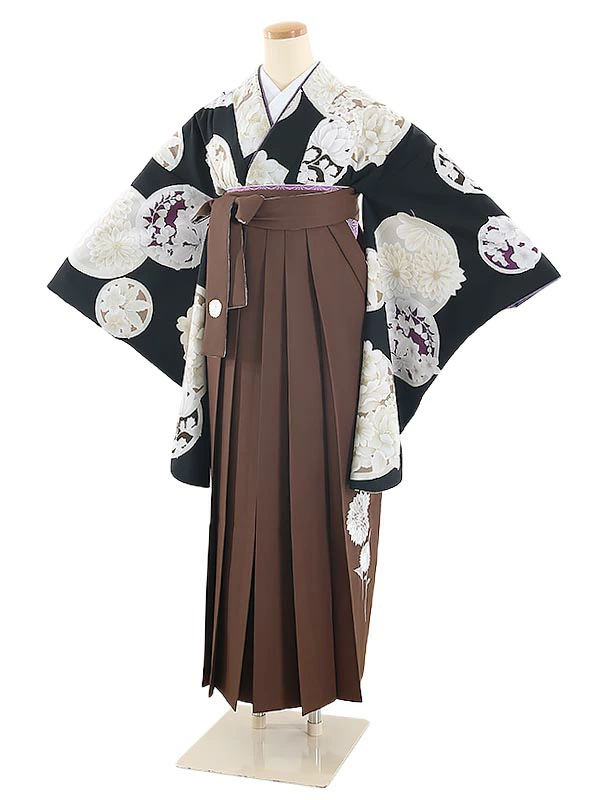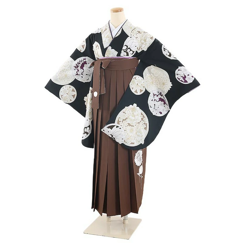 袴レンタル B011 紅一点 黒花丸紋×ブラウン袴セット 158cm-163cm [7号-13号] 大学生 卒業袴 貸衣装 女性 着物 専門学校 謝恩会 和装【0AGB011】