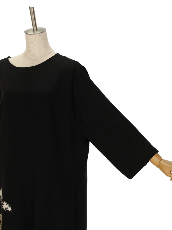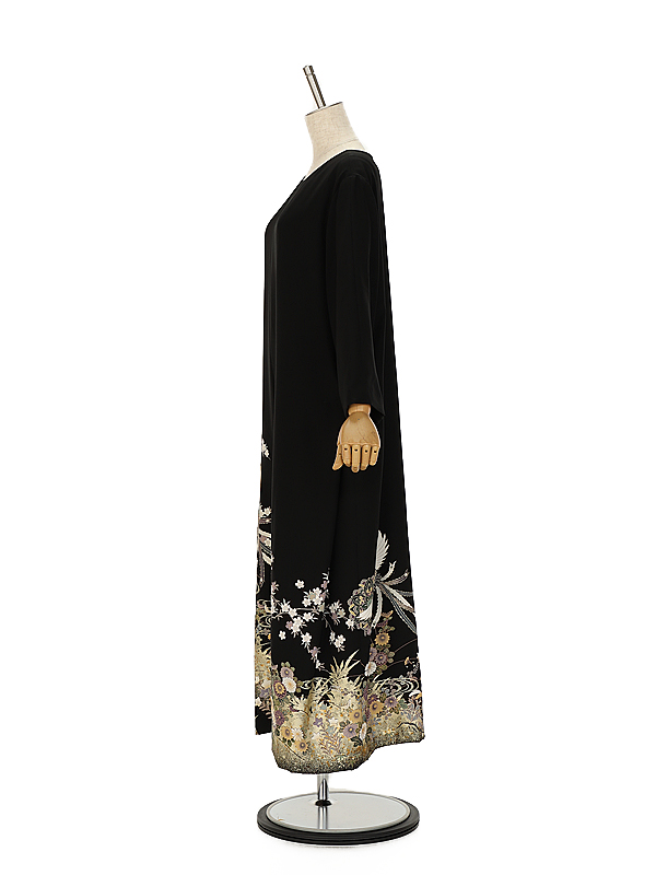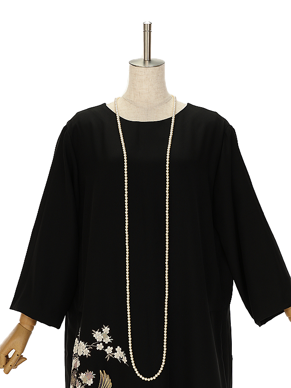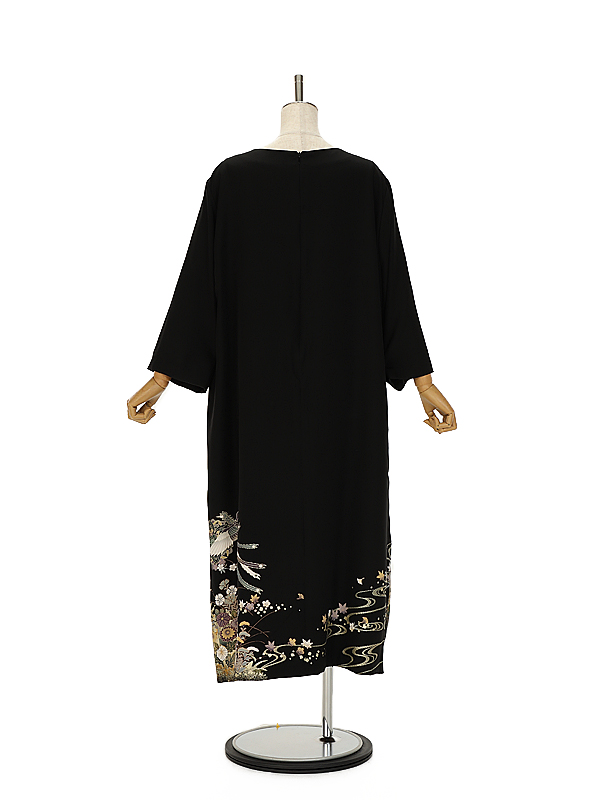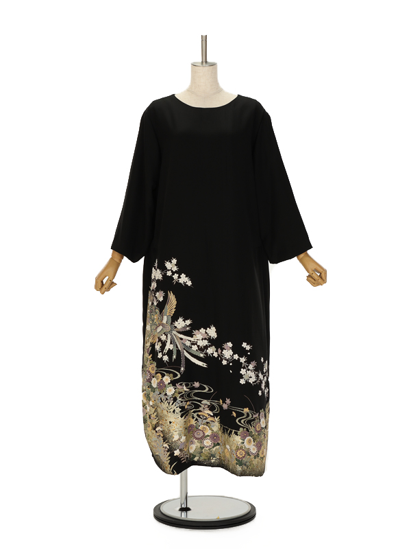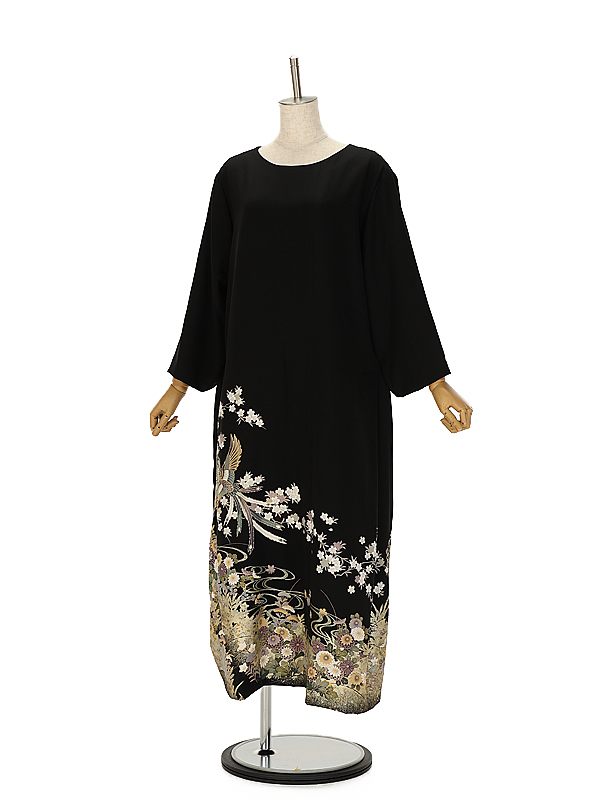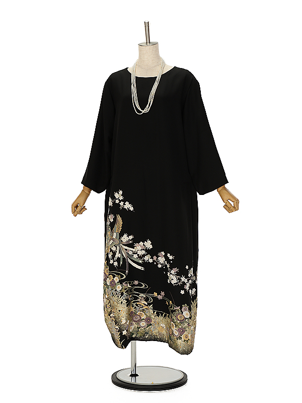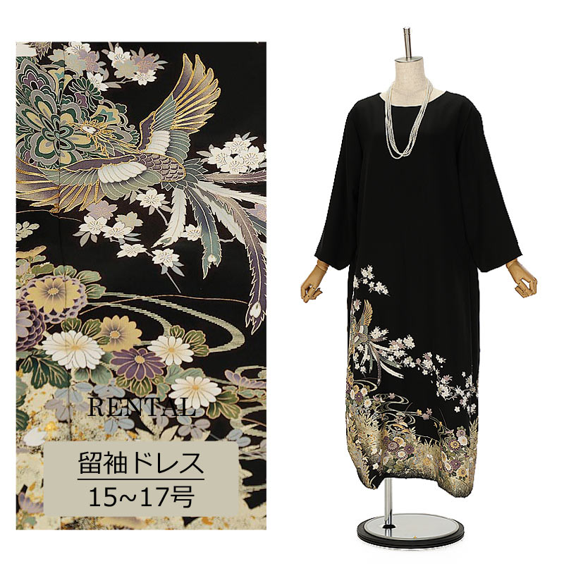 【レンタル】留袖ドレス 正絹 15号~17号 鳳凰つがい 流水 秋草花 ネックレス付き 0038 tk 黒留袖 七分袖 きものドレス レディースフォーマル 着物ドレス フォーマルワンピース 簡単着付け 着物リメイク 3L 30代 40代 50代 60代 70代 80代